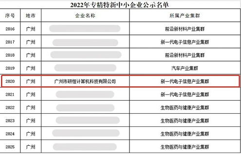 近日,廣東省工業(yè)和信息化廳正式公布2022年專精特新中小企業(yè)入選名單,經(jīng)專家綜合評(píng)定并公示,廣州市研恒計(jì)算機(jī)科技有限公司(以下簡(jiǎn)稱“廣州研恒”)榮獲“廣東省專精特新中小企業(yè)”稱號(hào),充分展示了廣州研恒的自主創(chuàng)新力與核心競(jìng)爭(zhēng)力。